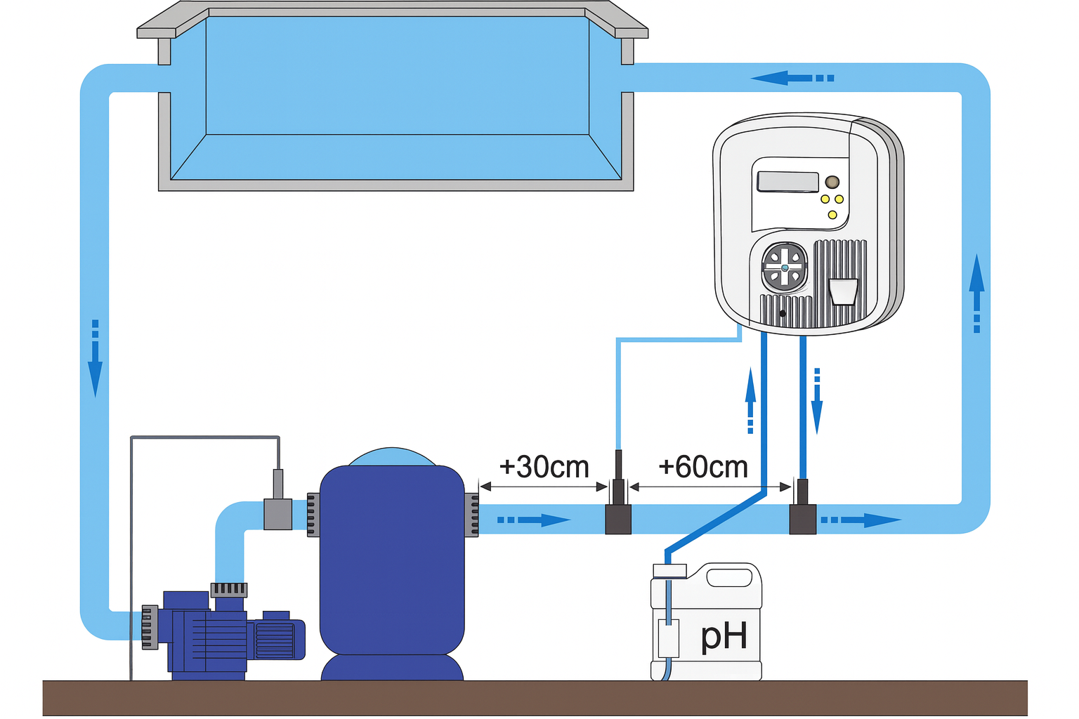 El tiempo de dosificación se adapta en función de la diferencia entre el pH de su piscina y el pH ideal.