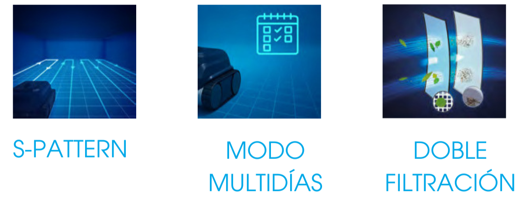 - Sistema S-Pattern: Sistema de navegación inteligente, que establece un recorrido estratégico para limpiar cada rincón de ls piscina, especialmente las rectangulares.
